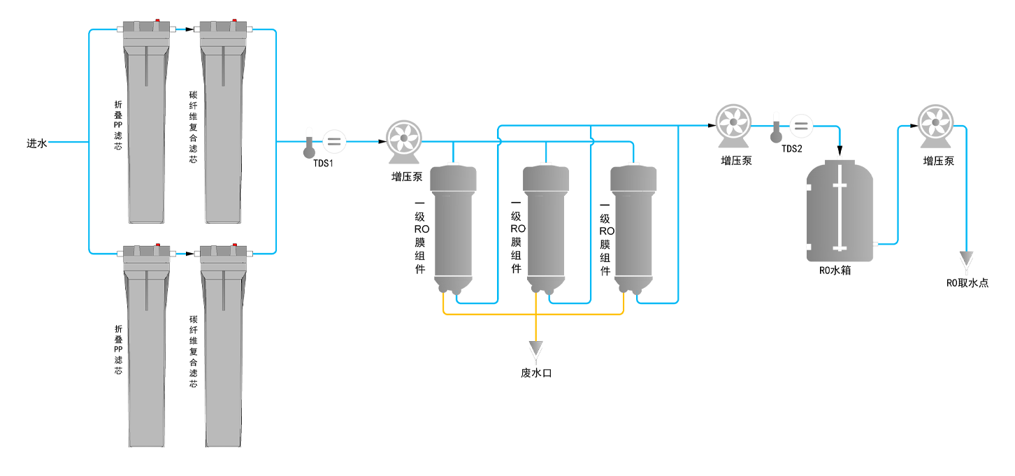 | 二級(jí)RO水 | 二級(jí)RO水離子截留率>99%(新RO膜),電導(dǎo)率 ≤5μs/cm; 有機(jī)物/顆粒/細(xì)菌截留率>99% | |||