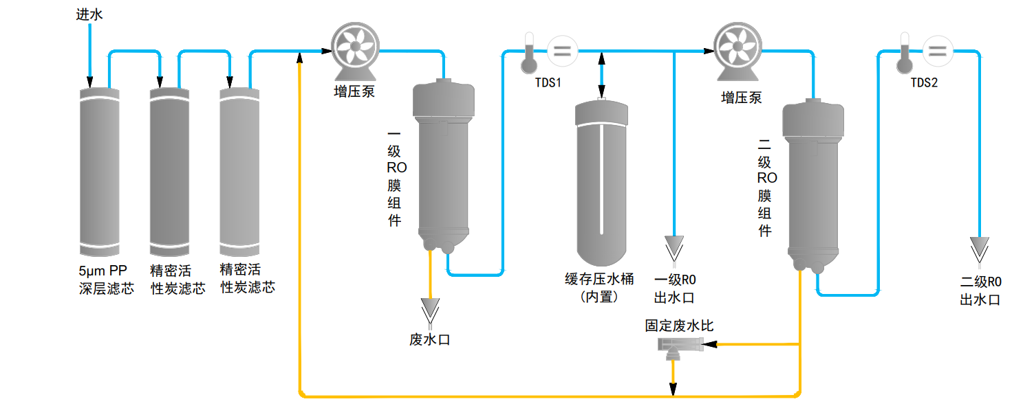 | ?一級RO水 | 離子截留率98%-99%(新膜),有機物截留率>99%(MW>200道爾頓)、顆粒和細菌截留率>99% | |
