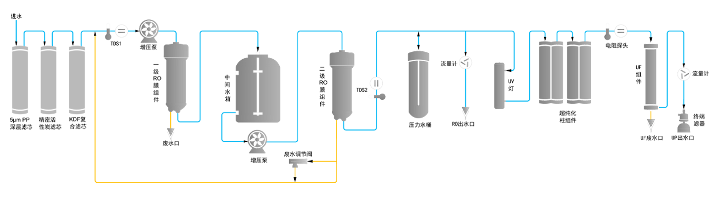 | 一級RO水 | 電導(dǎo)率≈源水電導(dǎo)率×5%,有機(jī)物截留率>99%(當(dāng)MW>200道爾頓) 顆粒和細(xì)菌截留率>99% | |||