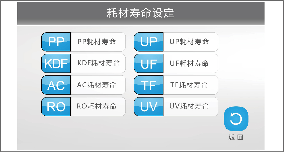 - ·PP、KDF、AC、RO、DI、UP、UV、UF、TF 耗材壽命可設(shè)定,顯示已使用時(shí)間及用量,到期自動提醒更換