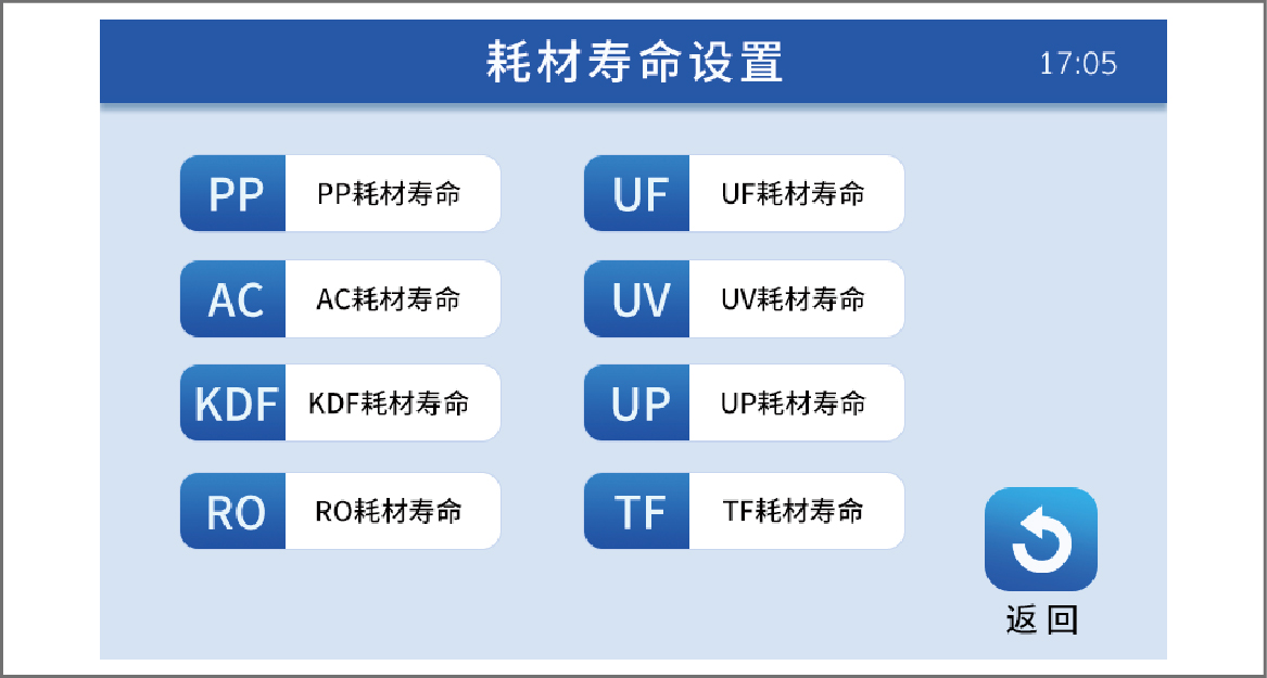- ·PP、KDF、AC、RO、DI、UP、UV、UF、TF 耗材壽命可設(shè)定,顯示已使用時(shí)間及用量,到期自動(dòng)提醒更換